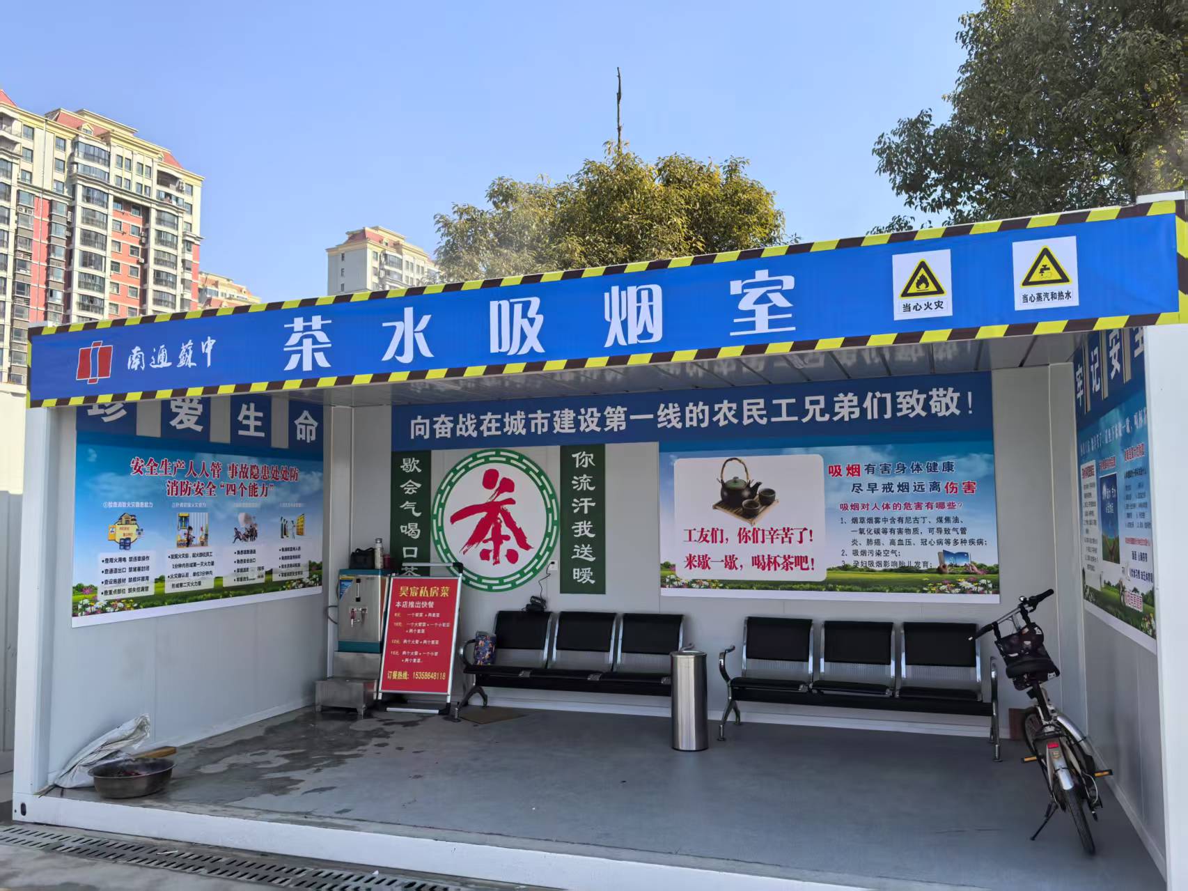 在緊張的施工之余,我們也不忘關懷每一位奮戰在一線的工人兄弟。特意設立的 “茶水吸煙室”,不僅為工友們提供了一個休息、放松的場所,更是傳遞著我們對他們辛勤付出的敬意與感謝。一句 “工友們,你們辛苦了!來歇一歇,喝杯茶吧!” 溫暖了無數人的心。在這里,大家可以稍作休息,補充水分,緩解工作的疲勞,以更好的狀態投入到后續的建設工作中。